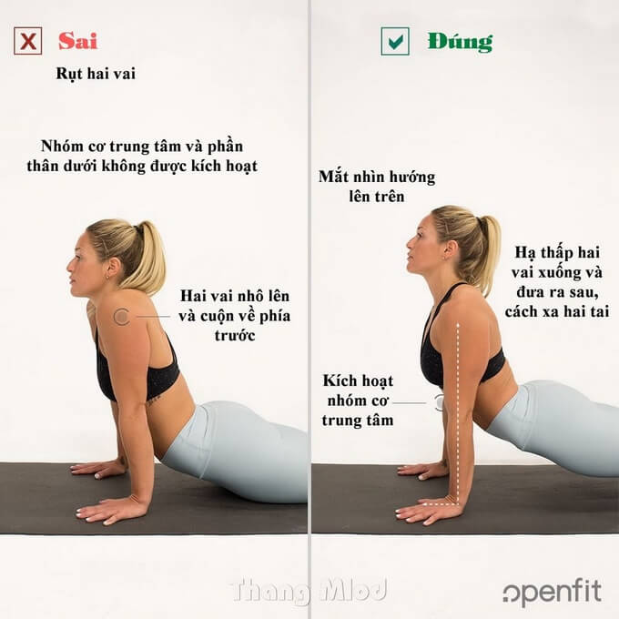 - Cách khắc phục: Hãy thư giãn hai vai của bạn. Trong các tư thế 'Đứng' với hai cánh tay giơ lên trên đầu. Hãy tìm sự cân bằng giữa lực ép nâng vai lên và lực ép hạ vai xuống. (Sự cân bằng ở giữa). Nếu cần, hãy mở rộng hai cánh tay của bạn bằng khoảng cách của hai vai. Trong tư thế Chó Ngẩng Mặt (Upward Facing Dog). Hãy nhấn hai bàn tay của bạn xuống thảm thật nhiều, giữ ánh mắt nhìn hướng lên trên thay vì nhin về phía trước và kéo dài đỉnh đầu của bạn lên để giữ cho cổ duỗi dài ra.