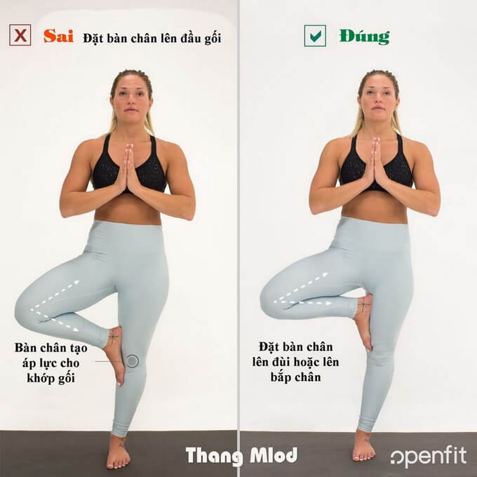 - Lỗi: Thực hiện tư thế Cái Cây với bàn chân đặt lên đầu gối chân trụ của bạn, đây là sai lầm hàng đầu của nhiều người (kể cả giáo viên và học viên).