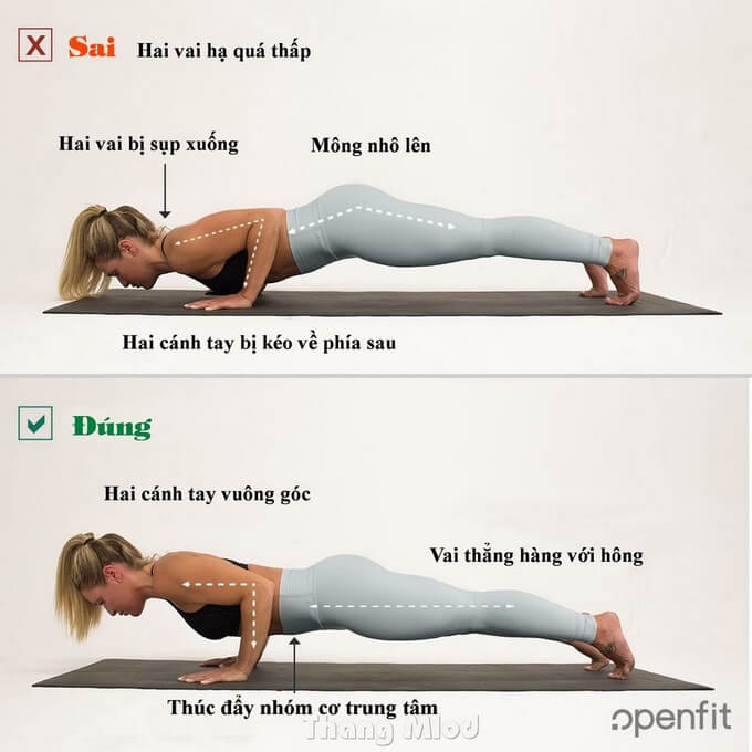 - Cách khắc phục: Chỉ hạ nửa người xuống để khuỷu tay của bạn tạo thành một góc 90 độ - không bao giờ hạ quá thấp. Hai Vai của bạn phải thẳng hàng với hông và khuỷu tay của bạn. Nếu bạn không thể duy trì để giữ được tư thế hãy đặt đầu gối xuống thảm.