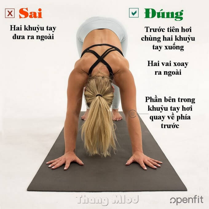 - Lỗi: Việc thả lỏng hai cánh tay của bạn trong khi chịu trọng lượng toàn bộ cơ thể, như ở tư thế Chó Úp Mặt (Downward Facing Dog Pose) hoặc Chó Ngẩng Mặt (Upward Facing Dog Pose). Điều này gây áp lực không đồng đều lên cấu trúc khớp khuỷu tay và có thể dẫn đến chấn thương, thậm chí là viêm xương khớp theo thời gian.