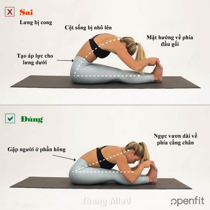 - Cách khắc phục: Hãy gập người từ phần hông chứ không phải từ lưng. Nếu gân kheo của bạn vẫn bị kéo căng bạn chỉ cần hơi co đầu gối lại. Khi thoát ra khỏi tư thế, bạn luôn giữ cho lưng thẳng và chỉ gập ở phần hông rồi nâng người lên.