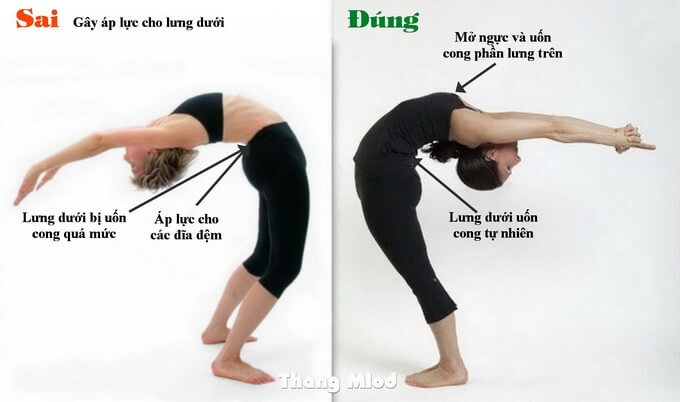 - Lỗi: Khi bạn chỉ tập trung uốn cong ở phần lưng dưới, lỗi này thường xẩy ra ở các tư thế Lạc Đà (Camel Pose), tư thế Bánh Xe (Wheel Pose) và tư thế Đứng Uốn Lưng Ra Sau (Standing Backbend Pose).v.v.