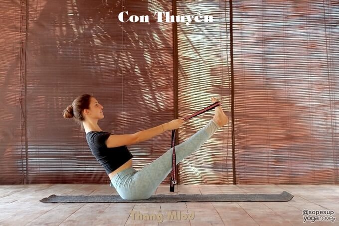 Trong tư thế Con Thuyền, lưng của bạn phải thẳng, hai chân nâng lên và duỗi thẳng, và hai cánh tay của bạn duỗi thẳng dọc theo chân. Nếu bạn gặp khó khăn trong việc giữ chân và lưng thẳng, có thể do nhóm cơ trung tâm (core) của bạn không đủ sức mạnh. Dây đai yoga sẽ hỗ trợ cho bạn thực hiện tư thế này (xem hình).