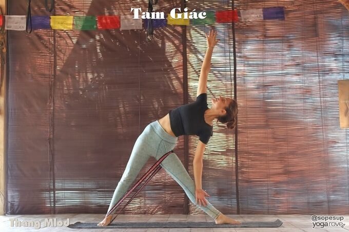Sử dụng dây đai yoga trên hai chân trong tư thế Tam Giác giúp tăng cường nhận thức về xương chậu của bạn. Dây sẽ lỏng ra nếu bạn nghiêng xương chậu về phía trước, do đó nó sẽ giúp bạn giữ xương chậu thẳng hàng. (xem hình)