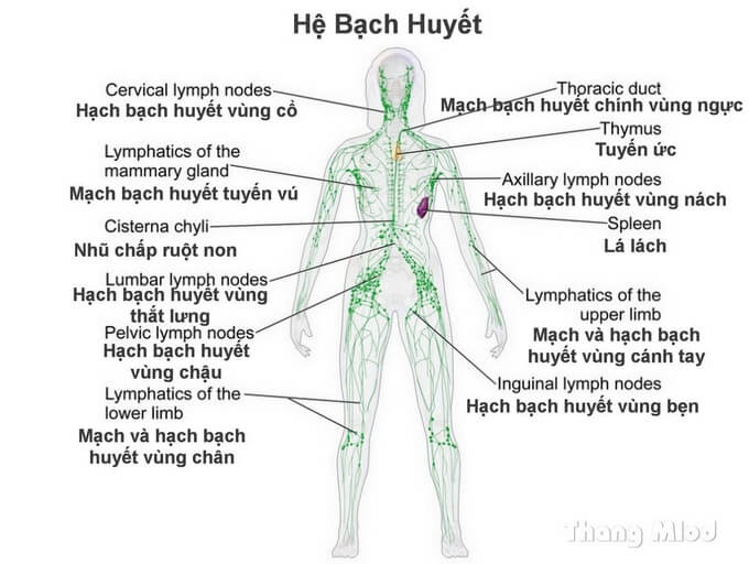 Hệ bạch huyết giúp cơ thể đào thải các chất thải và độc tố, chủ yếu thông qua việc bài tiết mồ hôi, nhu động ruột, nước bọt và nước tiểu. Trong dịch bạch huyết chứa các tế bào bạch cầu, chúng có tác dụng chống lại bệnh tật và ngăn ngừa sự lây lan của bệnh tật. Trong cơ thể chúng ta có khoảng 500-600 hạch bạch huyết, chúng nằm rải rác khắp cơ thể trên đường đi của mạch bạch huyết, thường tập trung thành nhóm và nhận bạch huyết của từng vùng trên cơ thể. Chúng sẽ sưng lên khi bạn bị cảm lạnh, chẳng hạn như ở hai bên cổ. Những hạch bạch huyết lớn nhất nằm xung quanh các cơ quan quan trọng như phổi, tim, tuyến thượng thận, nách và xung quanh vùng bẹn.